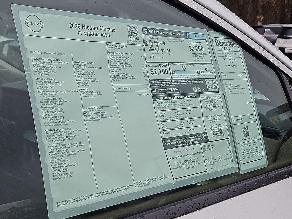 2026 Nissan Murano Platinum AWD — Best Price in Chesapeake, VA Upgrade your drive with this 2026 Nissan Murano Platinum, now available in Chesapeake, VA. This AWD crossover pairs a fuel-efficient 4-cylinder 2.0L gasoline engine with refined Platinum-level comfort and advanced technology. Enjoy confident handling in any season thanks to all-wheel drive and a responsive engine that balances performance and economy. Premium features include built-in Navigation, Apple CarPlay, Android Auto, and Remote Start for convenience and connectivity on every trip. Safety systems are robust with Forward Collision Warning to help protect you and your passengers. Inside, the Nissan Murano Platinum delivers a luxurious cabin with high-quality materials, spacious seating, and smart storage for daily practicality. This vehicle is competitively priced — we guarantee the best price in Chesapeake, VA — making exceptional value easy to drive home. Whether you commute, road trip, or need a capable family vehicle, the 2026 Nissan Murano Platinum blends technology, safety, and comfort in one sophisticated package. Schedule a test drive today to experience the handling of AWD and the convenience of modern connectivity features. Contact us to confirm availability, pricing, and financing options. Don't miss the opportunity to own this feature-rich 2026 Nissan Murano Platinum at the best price in Chesapeake.
