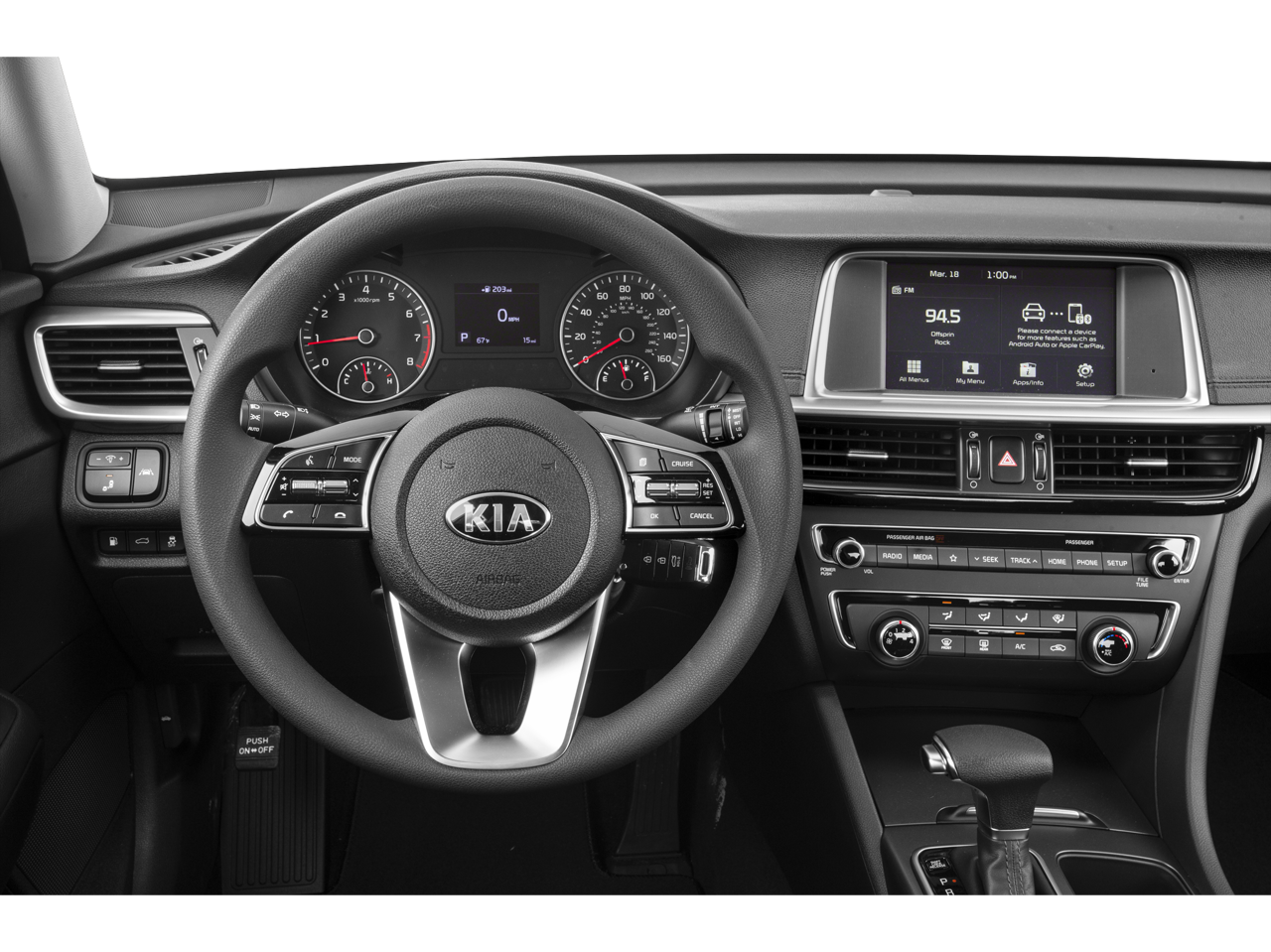 Bluetooth® technology is built into the vehicle, keeping your hands on the steering wheel and your focus on the road. Protect this model from unwanted accidents with a cutting edge backup camera system. The vehicle offers Apple CarPlay for seamless connectivity. This mid-size car stays safely in its lane with Lane Keep Assist. This vehicle is a certified CARFAX 1-owner. The vehicle offers Android Auto for seamless smartphone integration. The state of the art park assist system will guide you easily into any spot. Our dealership has already run the CARFAX report and it is clean. A clean CARFAX is a great asset for resale value in the future. Maintaining a stable interior temperature in this vehicle is easy with the climate control system. This Kia Optima shines with an exquisite metallic silver exterior finish. The vehicle has a 4 Cyl, 2.4L high output engine. This unit is front wheel drive.