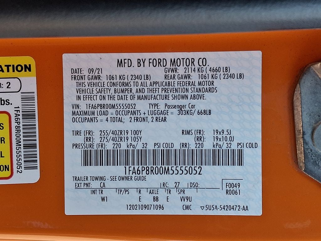 Equipment Group 600A: 5.0L Ti-VCT V8 Engine; 19" X 9.5" Front & 19" X 10" Rear Aluminum Wheels; TREMEC 6-Speed Manual Transmission; Cloth Bucket Seats; 255/40R19 Front and 275/40R19 Rear Summer Tires; AM/FM Stereo. Twister Orange Tri-Coat. **Equipment listed is based on original vehicle build and subject to change. Please confirm the accuracy of the included equipment by calling the dealer prior to purchase.**